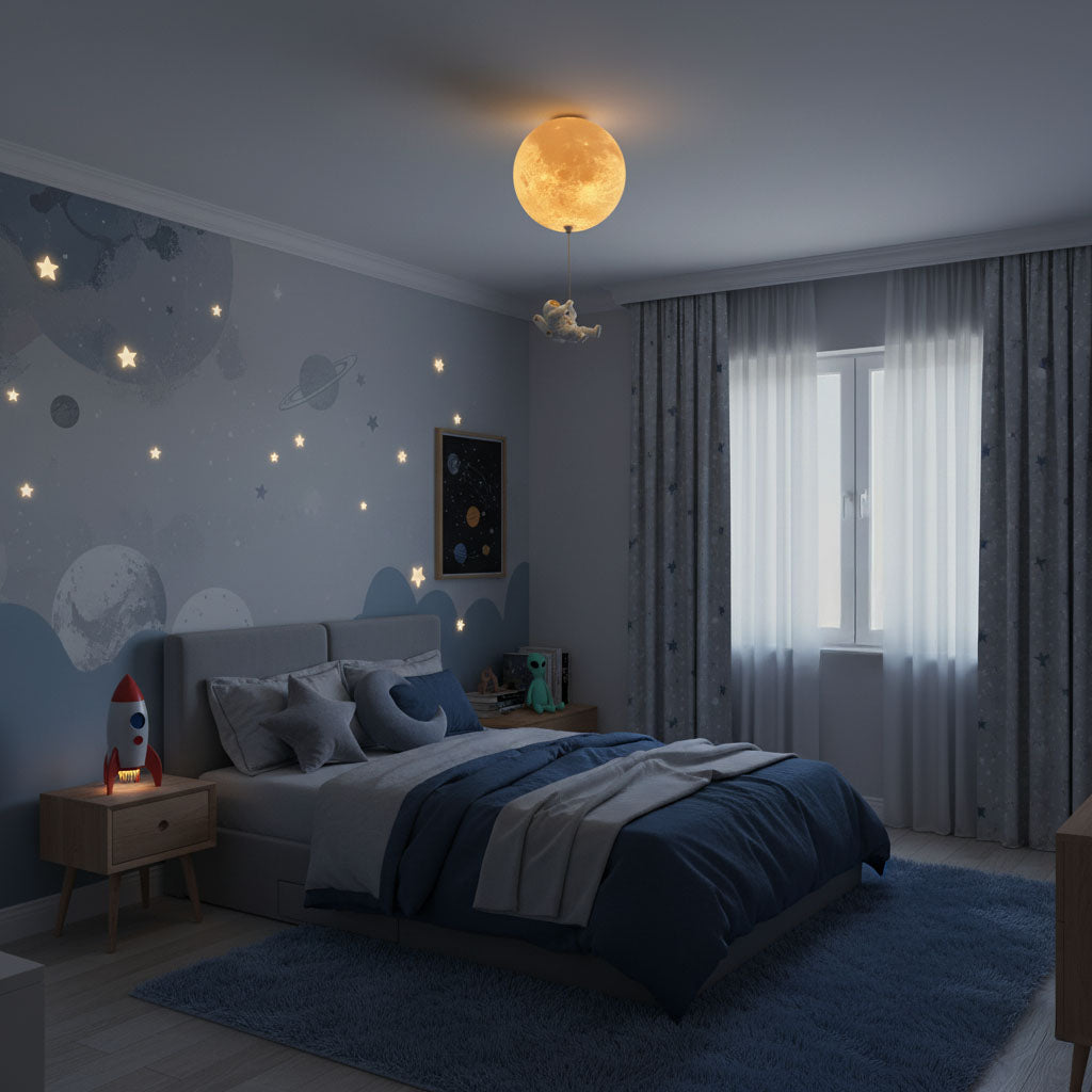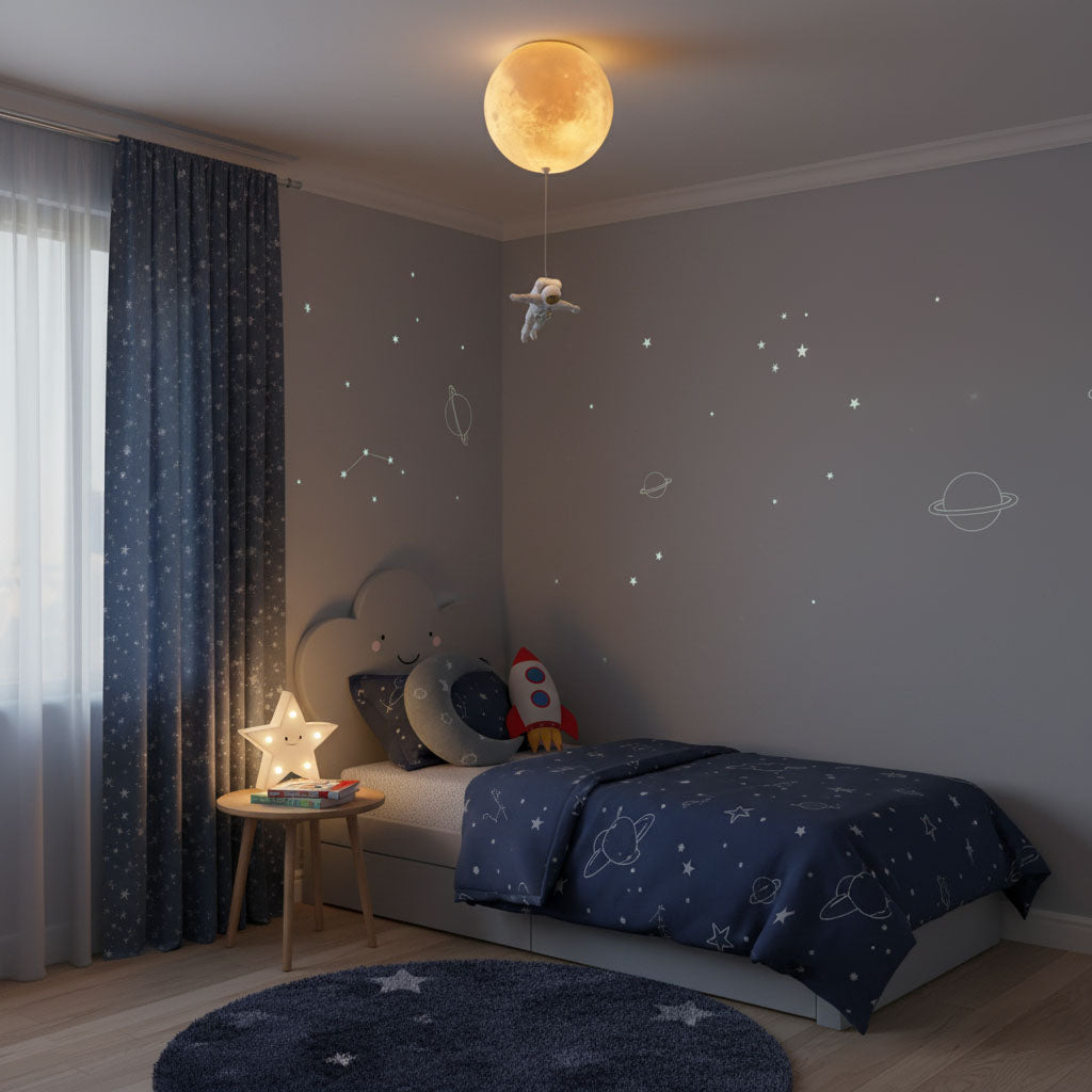 Bring bedtime to life with the SUPERMOON SENTINEL™ children's ceiling lamp. This playful design features a 3D-printed supermoon with an adorable astronaut dangling beneath, acting as a gentle guardian. The soft, soothing light hues create a dreamy atmosphere that comforts and sparks imagination, making it perfect for little dreamers ready to explore the night sky!